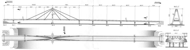 Мост через р. Шексну в Череповце металлический, однопилонный, двухплоскостной системы имеет главный пролет 194,25 м и боковой 136,49 м (см. рис. 1).