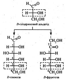 Всі ізомери моносахаридів підрозділяють на D- і L -стереохімічні ряди, належність до котрих визначається за конфігурацією асиметричного атома вуглецю, максимально віддаленого від карбонільної групи (для пентоз — С4, для гексоз — С5). Якщо конфігурація цього хірального атома вуглецю співпадає з конфігурацією D - гліцеринового альдегіду, то моносахарид відносять до D -ряду, якщо ж з конфігурацією L - гліцеринового альдегіду — то до L -ряду, наприклад: