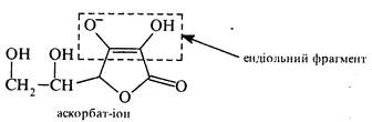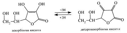 Аскорбінова кислота (вітамін С, γ-лактон 2,3-дегідро- L -гулонової кислоти). Водорозчинний вітамін, який міститься в багатьох овочах і фруктах. Нестача вітаміну С в їжі викликає захворювання цингу, а також зменшує опірність організму до інфекційних захворювань. Аскорбінова кислота – сильний відновний агент; при окисненні перетворюється на дегідроаскорбінову кислоту, котра, у свою чергу, здатна вельми легко відновлюватися до аскорбінової кислоти.