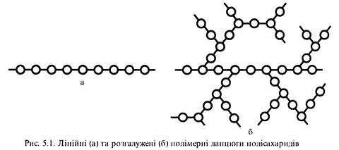 Найчастіше полісахариди складаються з декількох сотень і навіть тисяч моносахаридних залишків, які утворюють лінійні (а) або розгалужені (б) полімерні ланцюги (рис. 5.1).