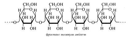 Амілоза – лінійний полімер, у котрому D -глюкопіранозні залишки сполучені α-1,4-глікозидним зв'язком; складається з 200-350 мономерних ланок: