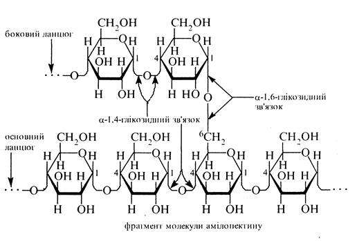 Амілопектин – полімер розгалуженої структури, котрий може вміщувати 1000 і більше залишків D -глюкози в молекулі. Молекулярна маса амілопектину досягає 1-6 млн. Всі ланцюги полісахариду основний та бокові – побудовані однотипно: залишки глюкози в них сполучені а-1,4-глікозидним зв'язком. Бокові відгалуження зв'язані з основним ланцюгом α-1,б-глікозидним зв'язком. Між двома сусідніми точками розгалуження основний ланцюг вміщує 20-25 моносахаридних залишків: