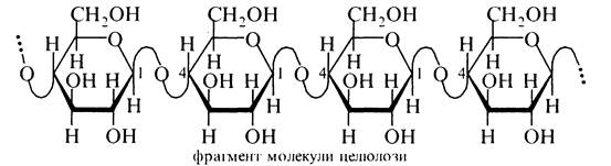 Целюлоза. Целюлоза широко розповсюджений у природі полісахарид, який є складовою частиною оболонок рослинних клітин. До складу деревини входить від 50 до 70 %, а до складу бавовна до 98 % целюлози. Молекула целюлози являє собою лінійний ланцюг, який складається з залишків D -глюкопіранози, сполучених між собою β-1,4-глікозидними зв'язками: