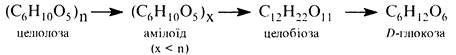 При нагріванні з мінеральними кислотами целюлоза гідролізується за схемою: