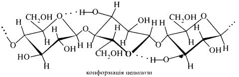 Молекула целюлози має строго впорядковану конформацію «жорсткого стрижня», у котрій глюкопіранозні залишки розміщені лінійно.