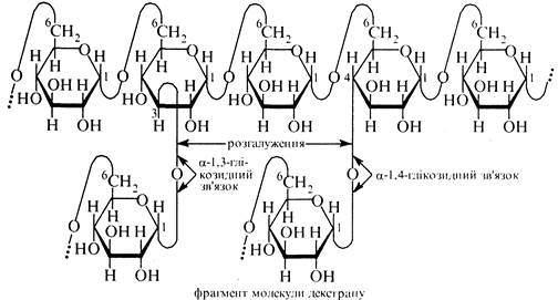 Декстрини. Декстрани це полісахариди бактеріального походження, побудовані з залишків α- D -глюкопіранози. Добувають їх з сахарози при участі бактерій Lcuconostoc mcscntcroides. Основним типом зв'язку в декстранах є α-1,б-глікозидний зв'язок, а у точках розгалуження α-1,4- і α-1,3-глікозидні зв'язки: