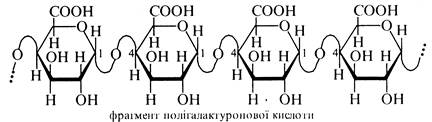 Пектинові речовини. До пектинових речовин (пектинів) відносять полісахариди, в основі будови котрих лежить полігалактуронова (пектова) кислота, побудована з залишків α- D -галактуронової кислоти, сполучених між собою 1,4-глікозидними зв'язками. Частина карбоксильних груп полігалактуронової кислоти етерифікована та знаходиться у вигляді метилового ефіру.