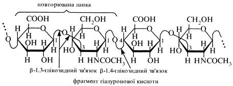 Гіалуронова кислота. Є одним з найбільш розповсюджених полісахаридів сполучної тканини. Міститься в хрящах, пуповині, суглобній (синовіальній) рідині, скловидному тілі. Повторюваною ланкою гіалуронової кислоти є D -глюкуронова кислота і N-ацетил- D - глюкозамін, сполучені β-1,3-глікозидним зв'язком. Зв'язок між дисахаридними фрагментами – β-1,4: