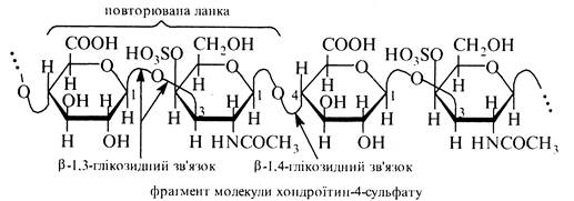 Хондроїтинсульфати один з головних компонентів хряща. Вони містяться також у шкірі, сухожиллях, склері, кістках. Повторюваною ланкою хондроїтинсульфатів є D -глюкуронова кислота і N-ацетил- D -галактозамін, який містить сульфатну групу. Всередині дисахаридного фрагмента зв'язок β-1,3; а між фрагментами р-1,4. Сульфатна група утворює ефірний зв'язок з гідроксильною групою М-ацетил- D -галактозаміну або в положенні 4 (хондроїтин-4-сульфат), або в положенні 6 (хондроїтин-6-сульфат):