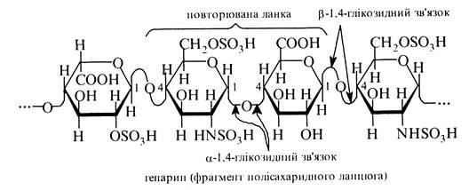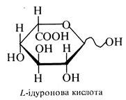 Гепарин. Виробляється в організмі людини і тварин, міститься у великих кількостях в печінці, легенях; в менших—у скелетних м'язах, селезінці, серцевому м'язі. Повторювана ланка в структурі гепарину складається з D -глюкозаміну й уронової кислоти, з'єднаних між собою α-1,4-глікозидними зв'язками. В якості уронових кислот виступають L -ідуронова кислота та, рідше, D -глюкуронова кислота: