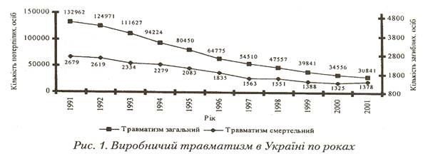За даними Національного науково-дослідного інституту охорони праці, стан виробничого травматизму в Україні за останнє десятиріччя характеризується зменшенням числа випадків як загального, так і смертельного травматизму. За період 1991-2001 рр. кількість травмованих зменшилась на 76,8%, смертельних травм - на 48,6%. Слід зазначити, що у 2001 р. кількість випадків смертельного травматизму порівняно з 2000 р. збільшилась з 1325 осіб до 1378 осіб, тобто на 53 особи (рис. 1).