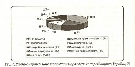 Найвищий рівень смертельного травматизму спостерігається у вісьмох галузях економіки, на які припадає 86% всіх смертельних випадків на виробництвах України (див. рис. 2).