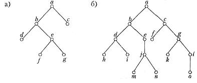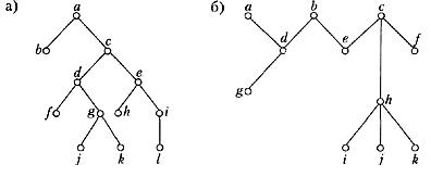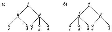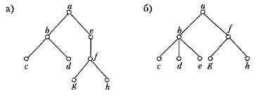25. Показати, що обхід наведених нижче кореневих дерев зверху вниз дає однакові списки вершин.