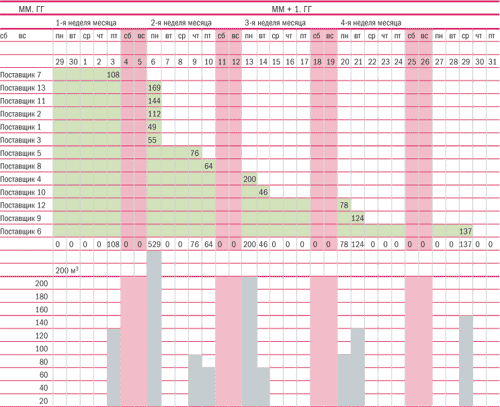 На гистограмме в свободные от приходов даты согласно заявкам планируем отгрузку в регионы, отмечая планируемые объемы и проставляя соответствующие этим объемам транспортные средства (в данном примере отмечено планируемое количество фур, «газелей», кунгов). Таким образом, мы получили информацию для составления графика прихода товара на склад. Начальнику отдела закупок полезно фиксировать фактические даты прихода заказов для последующего анализа сроков и выяснения причин отклонений, если они значительны (при этом не забываем и о контроле срока t4). Аналогичным образом можно составить и заполнить график отгрузки товара со склада, а также построить индивидуальные графики заказов для менеджеров отдела закупок. Для этого на сглаженном графике Ганта напротив каждого заказа проставляем название поставщика и фамилию ответственного менеджера. Для каждого конкретного менеджера на график Ганта выводится информация о заказах по тем поставщикам, за работу с которыми он ответственен. На полученных таким образом индивидуальных графиках отмечаются даты, когда надо начинать работу по тому или иному заказу (в данном примере в таблице 5 даты отмечены красным цветом).