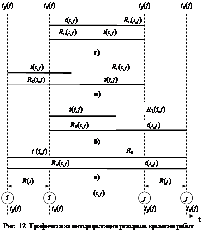 Следует отметить, что резервы времени работы (i,j), показанные на рис. 12, могут состоять из двух временных отрезков, если интервал продолжительности работы t (i,j) занимает промежуточную позицию между двумя его крайними положениями, изображенными на графиках.