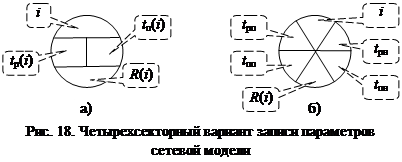 При четырехсекторном варианте деления кружка-события (рис. 18а) в верхнем секторе указывается номер (код) события (i), в левом – ранний срок наступления события { t р (i)}, в правом – поздний срок наступления события { t п (i)}, а в нижнем секторе записывается резерв времени события { R (i)}. Параметры работ записываются над соответствующими стрелками.
