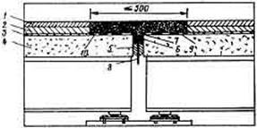 На рисунке показана конструкция шва. Технологические операции по его устройству выполняются в следующей последовательности: в месте расположения шва (ширина раскрытия проезжей части над которым обычно составляет 50 см) путем фрезерования устраивают желоб; стенки и дно желоба очищают струей горячего воздуха; полость желоба заполняют пропитанным пеньковым жгутом, а затем заливают вяжущим ВJ 200 до верхней кромки шва; шов перекрывают скользящим листом из алюминия или легированной стали, ширина которого равна ширине раскрытия шва; конструкцию шва фиксируют штифтами и покрывают слоем вяжущего BJ 200.
