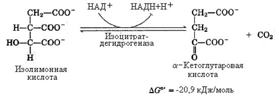 3-я реакция – дегидрирование и прямое декарбоксилирование изолимонной кислоты. Реакция катализируется НАД+–зависимым ферментом изоцитратдегидрогеназой. Фермент нуждается в присутствии ионов марганца (или магния). Являясь по своей природе аллостерическим белком, изоцитратдегидрогеназа нуждается в специфическом активаторе – АДФ.