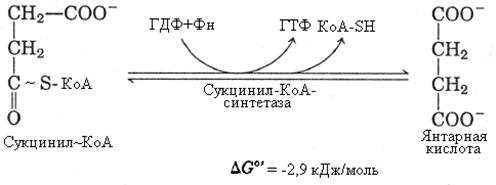 5-я реакция – субстратное фосфорилирование. Суть реакции заключается в переносе богатой энергией связи сукцинил-КоА (макроэргическое соединение) на ГДФ с участием фосфорной кислоты – при этом образуется ГТФ, молекула которого вступает в реакцию перефосфорилирования с АДФ – образуется АТФ.