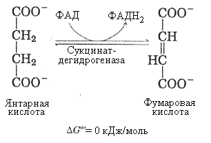 6-я реакция – дегидрирование янтарной кислоты сукцинатдегидрогеназой. Фермент осуществляет прямой перенос водорода с субстрата (сукцината) на убихинон внутренней мембраны митохондрий. Сукцинатдегидрогеназа - II комплекс дыхательной цепи митохондрий. Коферментом в этой реакции является ФАД.