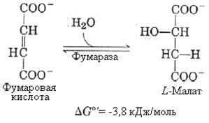 7-я реакция – образование яблочной кислоты ферментом фумаразой. Фумараза (фумаратгидратаза) гидратирует фумаровую кислоту – при этом образуется яблочная кислота, причем ее L -форма, так как фермент обладает стереоспецифичностью.
