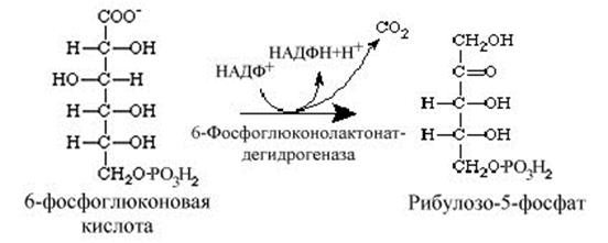 Третья реакция – дегидрирование и декарбоксилирование 6-фосфоглюконолактона ферментом 6-фосфоглюконатдегидрогеназой, коферментом которого является НАДФ+. В ходе реакции восстанавливается кофермент и отщепляется С-1 глюкозы с образованием рибулозо-5-фосфата.