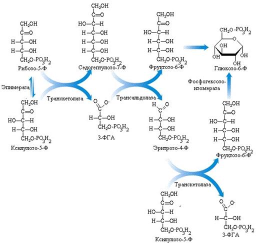 Глюкозо-6-Ф + 7Н2О + 12НАДФ+ 5 Пентозо-5-Ф + 6СО2 + 12 НАДФН?Н+ + Фн.