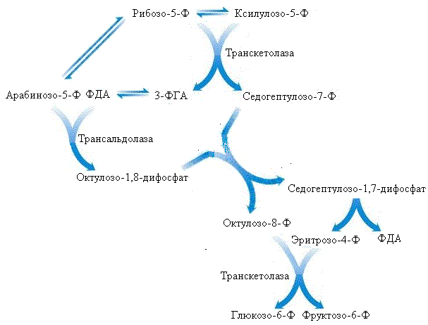 Затем два образовавшиеся соединения реагируют друг с другом в трансальдолазной реакции; при этом в результате переноса 3С-фрагмента от седогептулозо-7-фосфата на 3-ФГА образуются эритрозо-4-фосфат и фруктозо-6-фосфат.Это F-вариант пентозофосфатного пути. Он характерен для жировой ткани.