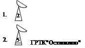 | Телевизионная станция. Цвет знака - черный. 1. Подвижная 2. Стационарная с указанием мощности (2;5 кВт) и принадлежности (ГРТК "Останкино") | |||