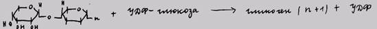 Эта реакция равно как и многие другие реакции биосинтеза запускаются гидролизом пирофосфата. На следующем этапе происходит образование связи а-1,4-гликозидгликозной в молекуле гликогена, которая последовательно удлиняется на! глкжозный остаток. Присоединение уридиндифосфатглюкозы осуществляется с невосстанавливающего конца цепи молекулы гликогена (С4). Таким образом, для процесса биосинтеза нужна «гликогеновая» затравка.