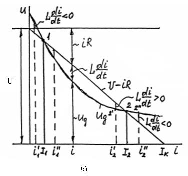 На рис.3,б совместно с ВАХ дуги построена реостатная характеристика – прямая