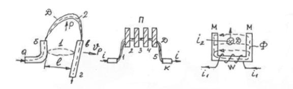, вызываемого взаимодействием тока дуги i2 с магнитным полем, искусственно создаваемым между полюсами стального магнитопровода М. Магнитный поток Ф создается током i1 протекающим по обмотке w.