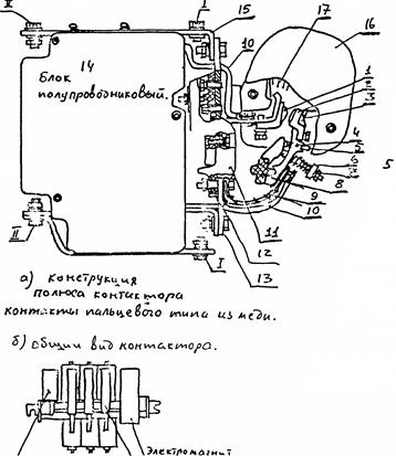 Конструкция контакторов моноблочная. Основные сборочные единицы: магнитная система, системы контактов главной и вспомогательной цепей. Контакторы с бездуговой коммутацией имеют полупроводниковый блок.