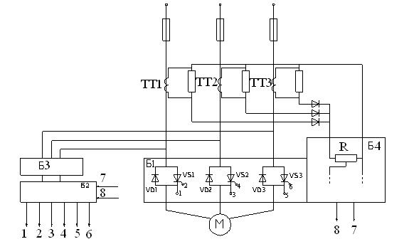 Силовой блок Б1 содержит тиристоры VS1-VS3 и диоды VD1-VD3. При подаче сигнала управления на электроды 1-6 тиристоры открываются, и двигатель подключается к сети. В отрицательный полупериод, когда тиристоры закрываются, ток двигателя проходит по диодам VD1-VD3.