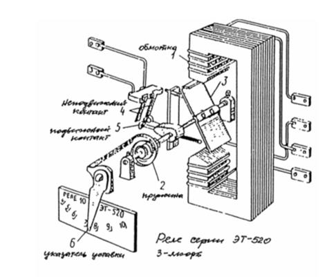 Магнитопровод реле серии ЭТ шихтуется. Обмотка реле разбита на две части. Якорь выполнен из тонкого листа эл. технической стали и имеет Z-образную форму и укреплен на валу. Подвижный контакт мостикового типа шарнирно укреплен на рычаге, связанным с валом.