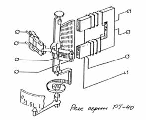 Якорь Г-образной формы выполнен из тонкого листа эл.технической стали. С осью якоря связаны два мостиковых контакта с серебряными накладками.