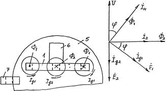 Рисунок 40. Упрощенная схема однофазного счетчика и векторная диаграмма токов и потоков в счетчике.