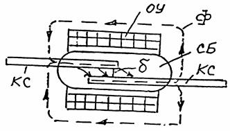 Магнитный поток Ф, создаваемый ОУ проходит по КС через рабочий зазор δ между ними и замыкается по воздуху вокруг катушки. Поток создает силу Р, которая, преодолевая упругость КС, соединяет их между собой.