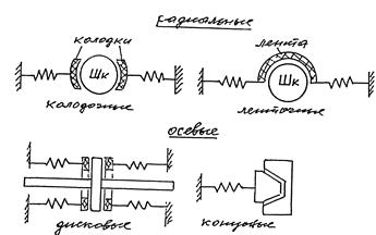 По конструктивному исполнению (рис.46) тормозные устройства делятся на радиальные и осевые.