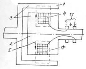 Устройство фрикционной муфты показано на рис.47. Валы входят в зацепление за счет кольцеобразных поверхностей трения 4, которые соприкасаются при рабочем перемещении якоря 5 под действием магнитного поля, создаваемого катушкой управления 2. Магнитный поток замыкается через якорь.