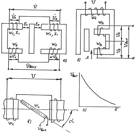 Рисунок 54. Трансформаторные датчики: а) дифференциальный; б) с изменяемой площадью зазора; в) с поворотной рамкой.