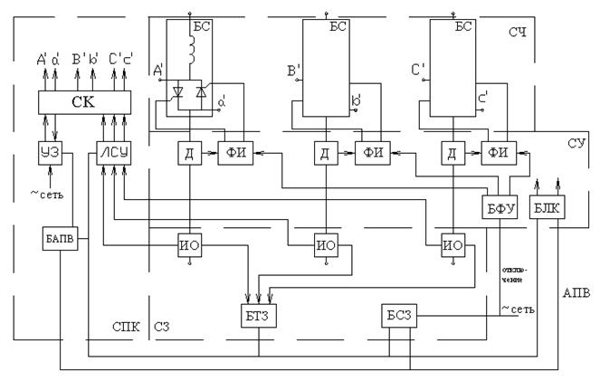 СК – система принудительной коммутации служит для гашения тока в силовых тиристорах. Она состоит из устройства заряда конденсатора УЗ, узла БАПВ и логической системы управления ЛСУ, которая связана с измерительными органами ИО.