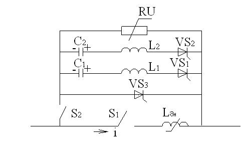 Одна из таких схем с принудительным запиранием тиристоров и с ускоренным переводом тока в полупроводниковый блок приведена на рис.61. Схема содержит конденсатор С1 и С2, тиристоры VS1, VS2 и VS3, индуктивности в цепи тиристоров L1 и L2, дроссель насыщения Lдн с прямоугольной петлей гистерезиса и защитный варистор RU. За счет применения дросселя насыщения удается снизить разрываемый ток в цепи контактов за счет его быстрого перетекания в цепь тиристоров.