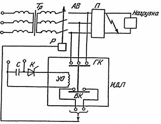 Конденсатор С заряжается от постороннего источника. При возникновении аварии в нагрузке датчик тока открывает тиристор К и конденсатор С разряжается на катушку ИДП (У0). Диск привода перемещает подвижные контакты и замыкает три фазы на питающем трансформаторе.