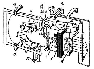 1-электромагнит; 2- короткозамкнутые витки; 3- диск; 4- рамка; 5- пружина; 6- постоянный магнит;7- червяк; 8- зубчатый сегмент; 9- коромысло; 10- якорь; 12- контакты; 13- винт; 14- штепсель; 15- гнезда планки; 16- винт; 17,11- упоры рамки; 18- подшипник; 19- обмотка; 20- упор.