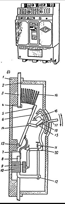 а- общий вид; б- схематический разрез; 1- основание; 2- крышка; 3- шина; 4- неподвижный контакт; 5,6- подвижный контакт; 7- гибкий проводник; 8 шина расцепителей; 9- якорь электромагнита; 10-сердечник электромагнита; 11- пружина; 12- термобиметаллический элемент; 13-ось;14-16- рычаги механизма свободного расцепителя; 17- рукоятка; 18- дугогасительная решетка; 19-отключающая пружина; 20- собачка расцепителя.