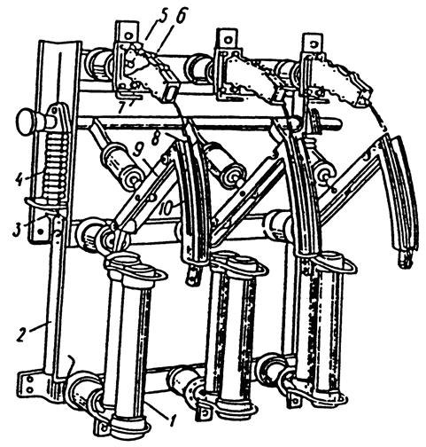 1-предохранители ПК; 2- каркас для предохранителей; 3-резиновые шайбы; 4- отключающая пружина; 5- неподвижный контакт рабочего контура; 6- дугогасительная камера; 7- неподвижный контакт рабочего контура; 8- подвижный контакт дугогасительного контура (нож); 9-подвижный контакт рабочего контура; 10- стальные полосы.