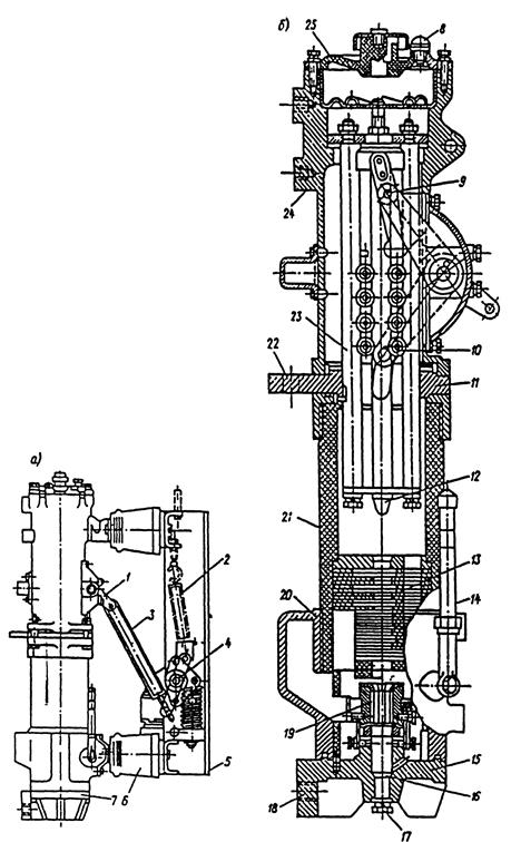 а- общий вид; б- бак выключателя; 1- рычаг; 2- отключающая пружина; 3- тяга; 4- вал; 5- рама; 6- изоляторы; 7- бак; 8 и 17- пробки; 9- механизм управления; 10- токосъемное устройство; 11 и 20- фланцы; 12- стержневой контакт; 13- камера поперечного дутья; 14- маслоуказательное стекло; 15 и 25- крыши; 16- отверстие; 18 и 22- выводы; 19- розеточный контакт; 21- цилиндр; 23- направляющая; 24- корпус.