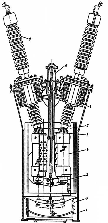 1- бак; 2- трубчатые нагреватели; 3- траверса с подвижными контактами; 4- дугогасительное устройство с шунтом; 5- направляющее устройство; 6- изоляция бака; 7- трансформаторы тока; 8- механизм выключателя; 9- маслонаполненный ввод.
