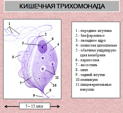 Кишечная трихомонада (Trichomonas hominis). Вызывает кишечный трихомонадоз.